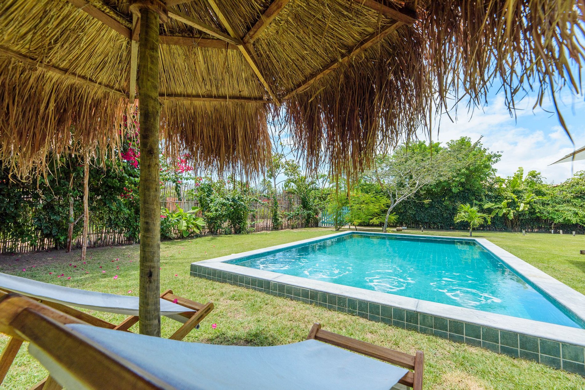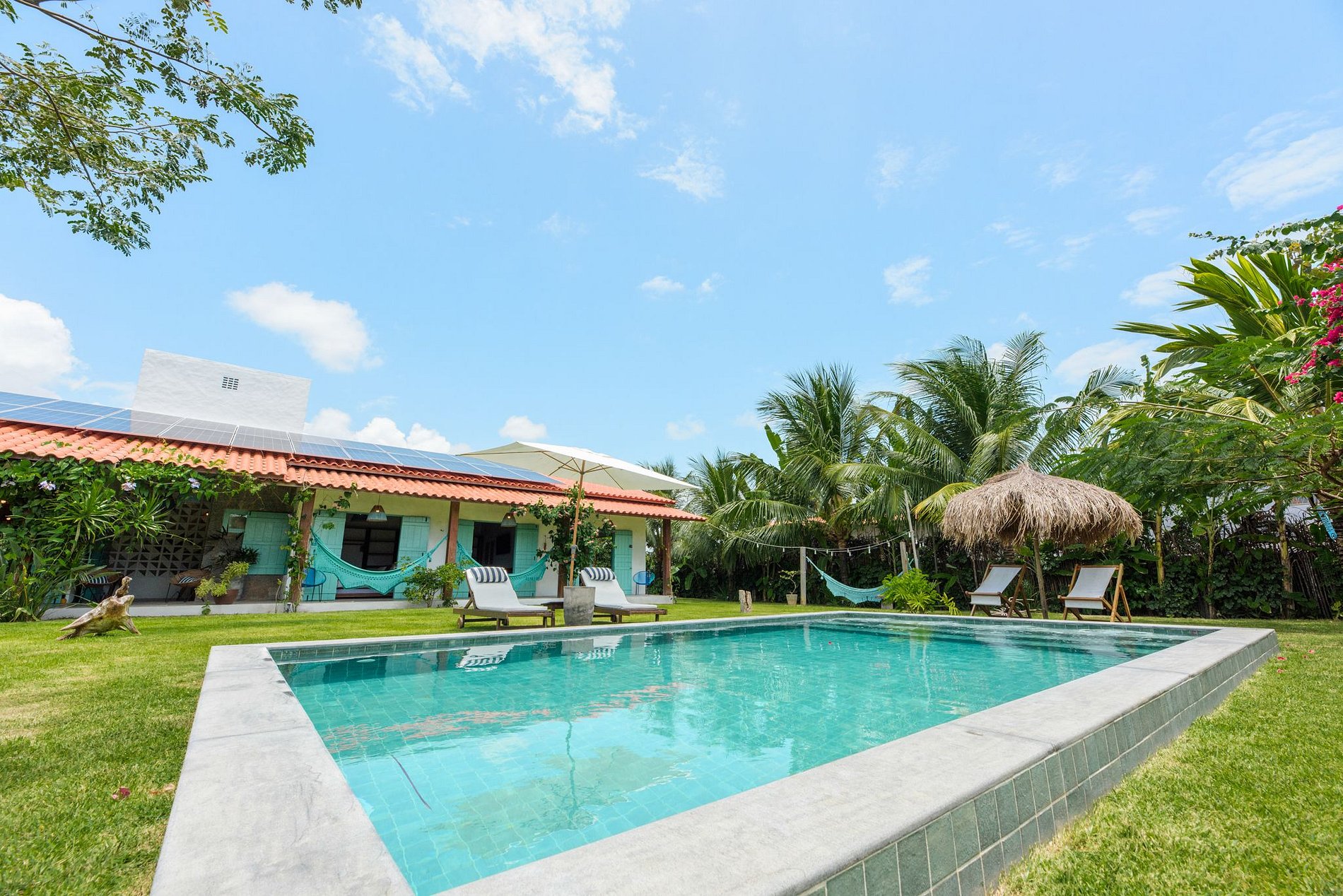 IG: @casatatu_ para mais fotos. A casa tem pé direito alto, a parede vazada propicia uma ventilação natural, tornando a casa mais arejada, aconchegante e clara. Com piscina privativa com água sempre morna. A casa é ampla, temos cozinha e sala de estar integradas! Em ambiente separado temos 3 suítes integrados por um amplo hall. Contamos com suíte extra com acesso pela varanda. Todos os quartos têm vista para piscina com total privacidade. Suíte 1: Cama queen e uma bicama de casal; Suíte 2: Cama king e duas bicamas de solteiro. Suíte 3: 01 Cama King e 01 reversível de casal. As suítes são amplas, com ar condicionado e banho quente. A cozinha é equipada com todos os utensílios necessários para uma boa estadia, varandas com redes de descanso, jardins gramados com coqueiros e muitas flores. Varanda principal com mesa de jantar. Temos cadeirinha de alimentação, berço e banheira para bebês. Nossa piscina é perfeita e sempre com água morna.