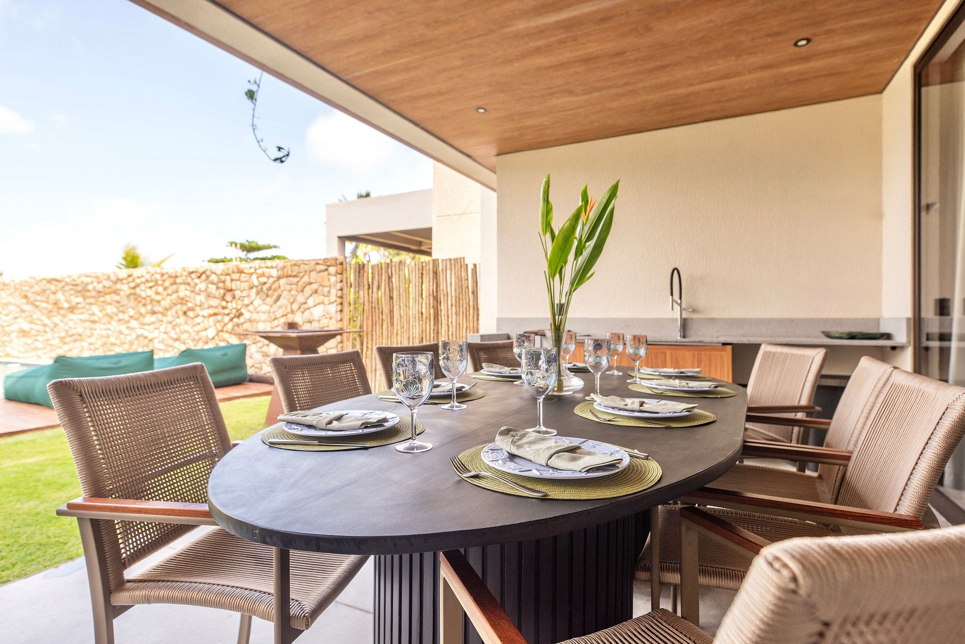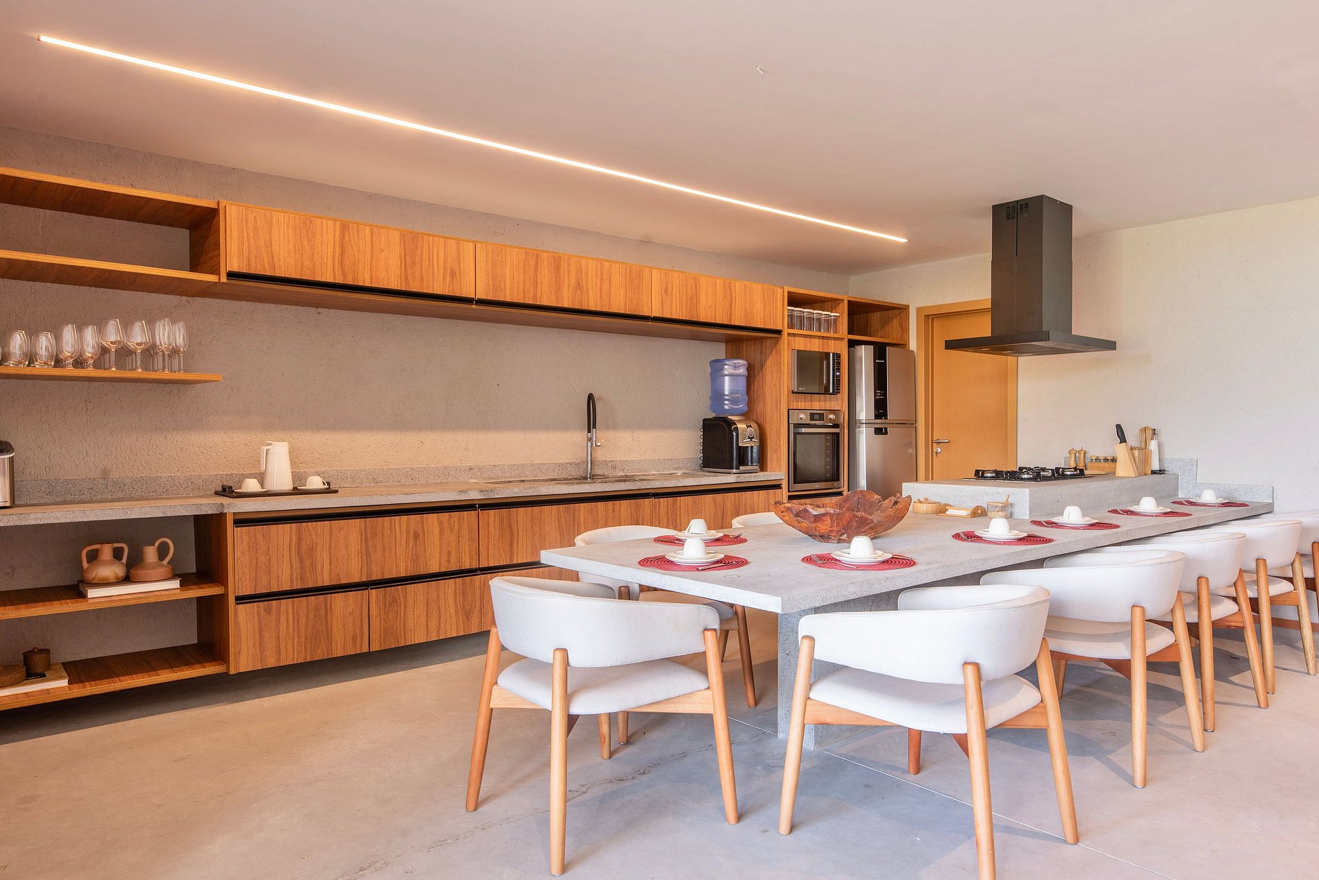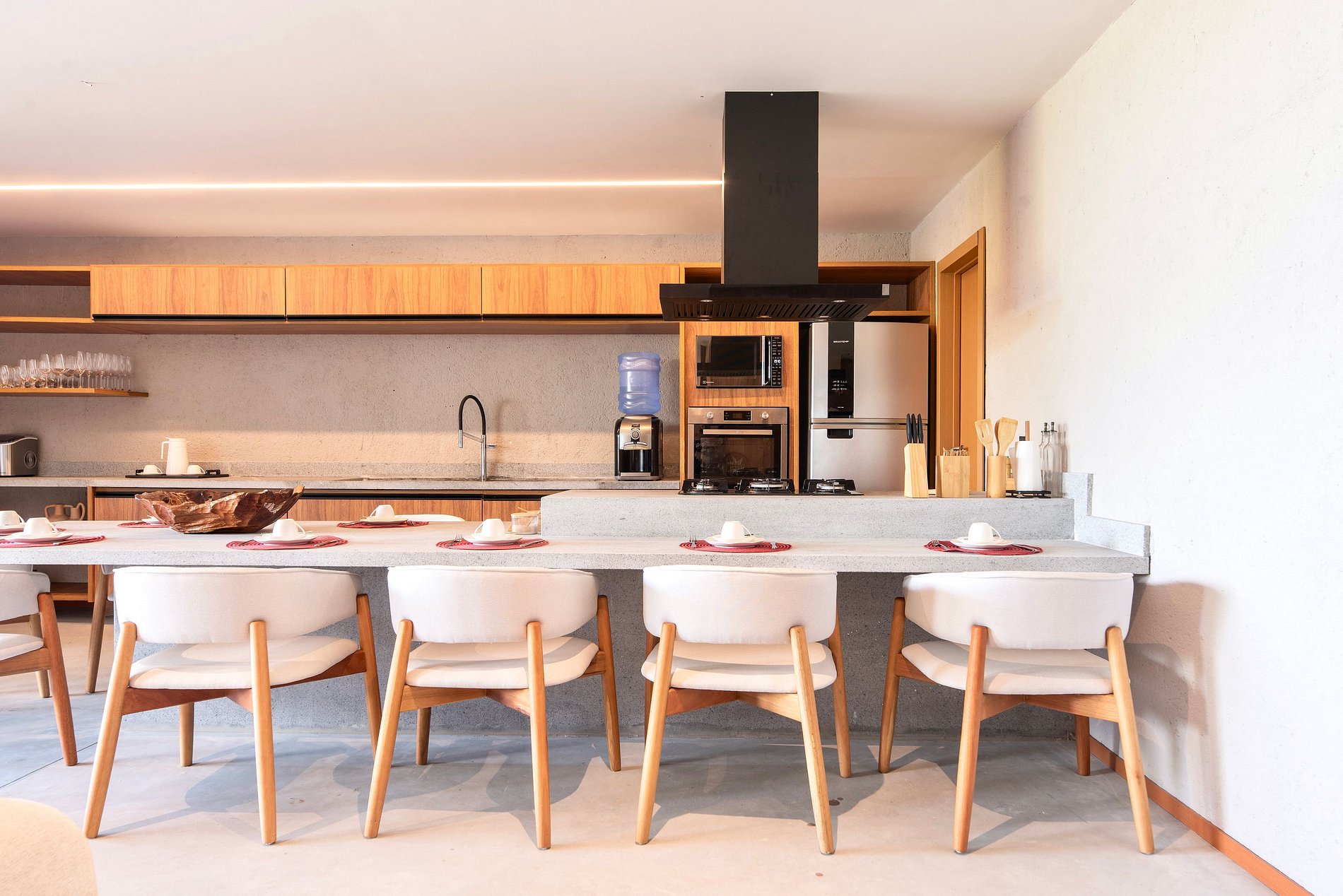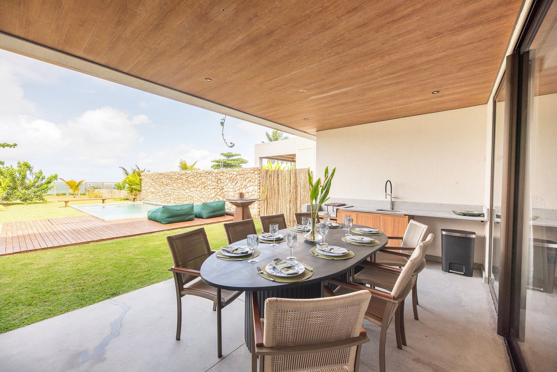 Cozinha: A cozinha é completa e conta com o necessário para uma boa estadia. Padrão M.Stays. A casa conta ainda com churrasqueira móvel, cadeiras de praia e guarda-sol do condomínio, e caixa térmica. Rooftop com vista mar, Smart-TV, adega e cervejeira. Disponibilizamos até 01 berço e 01 cadeira de alimentação para crianças de até 2 anos (sob reserva).